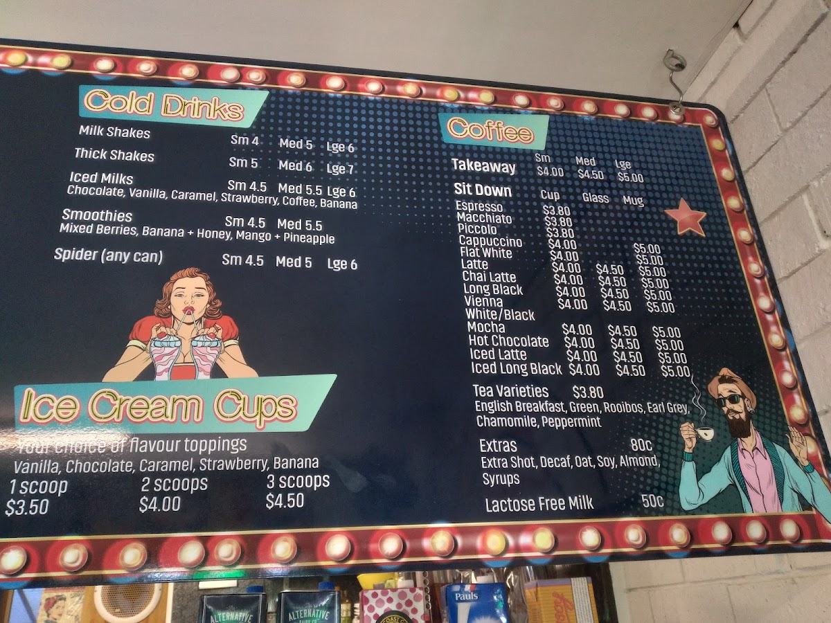 Beverage options focus primarily on coffee, with a variety of styles offered for both takeaway and sit-down service. Choices include Espresso, Macchiato, Piccolo, Cappuccino, Flat White, Latte, Chai Latte, Long Black, Vienna, Mocha, Hot Chocolate, Iced Latte, and Iced Long Black.